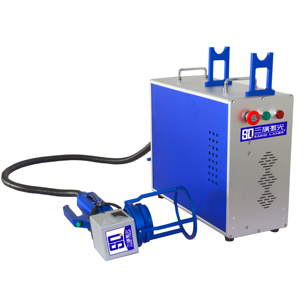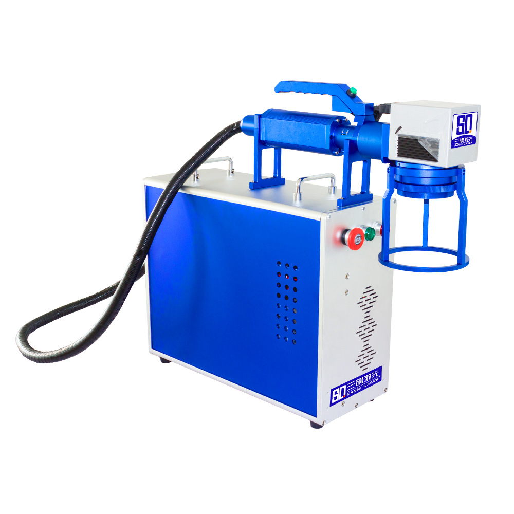 三旗激光手持式光纤打标机是激光束在各种不同的物质表面打上永久的标记,打标的效应是通过表层物质的